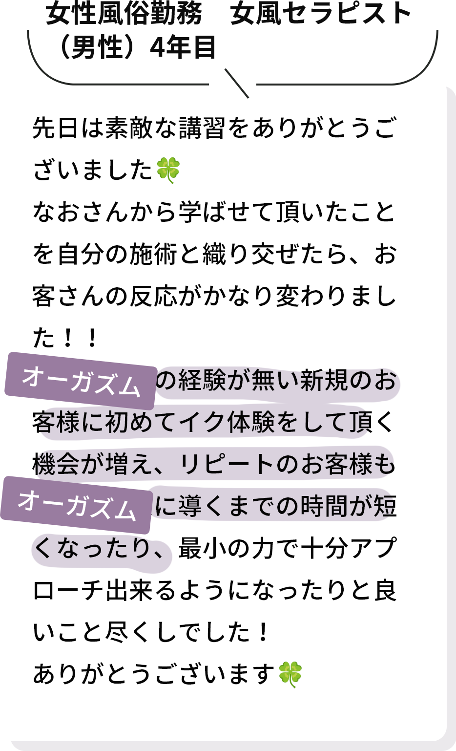 リピートされるセラピスト 脳ガズムメソッドは体だけ見るのではなく心や脳まで見れるセラピストを目指します。